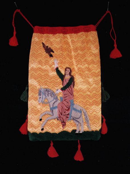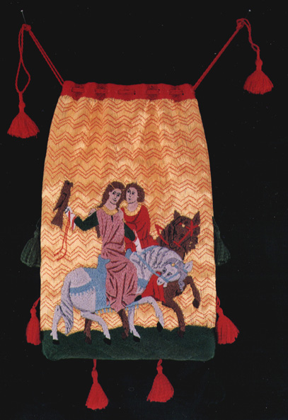I based construction of this purse on two French purses of the mid-1300's, which are pictured in A Pictorial History of Embroidery, by Marie Schuette & Sigrid Mueller-Christiansen (Frederick Praeger, New York, 1963, available through your library via interlibrary loan).